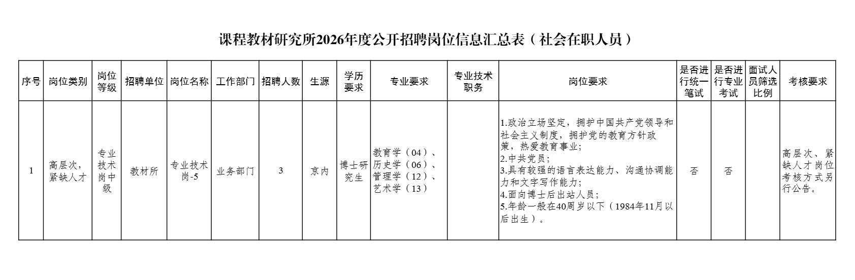 课程教材研究所是具有独立法人资格的教育部直属事业单位,是国家级高水平课程教材专业研究平台。主要职责任务是:组织开展课程教材研究、促进国家教育事业发展;开展课程教材建设重大理论和实践问题研究;参与教材编写研究、指导和审核;组织开展基础教育教研;组织开展相关考试命题质量评估;组织开展课程教材实施与改革试验研究;组织课程、教材、教学和图书资源研究开发与宣传推荐工作;开展相关国际交流与项目合作。根据工作需要,现面向社会在职人员公开招聘工作人员3名。现将有关事项公告如下: