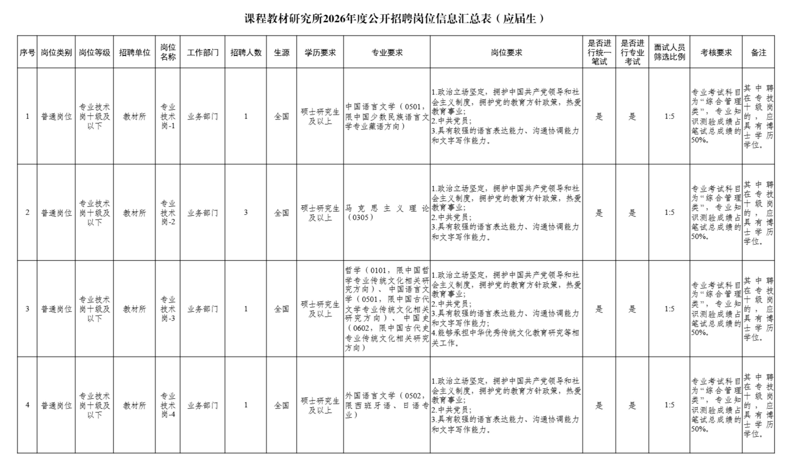 课程教材研究所是具有独立法人资格的教育部直属事业单位,是国家级高水平课程教材专业研究平台。主要职责任务是:组织开展课程教材研究、促进国家教育事业发展;开展课程教材建设重大理论和实践问题研究;参与教材编写研究、指导和审核;组织开展基础教育教研;组织开展相关考试命题质量评估;组织开展课程教材实施与改革试验研究;组织课程、教材、教学和图书资源研究开发与宣传推荐工作;开展相关国际交流与项目合作。根据工作需要,现面向普通高等学校应届毕业生公开招聘工作人员6名。现将有关事项公告如下: